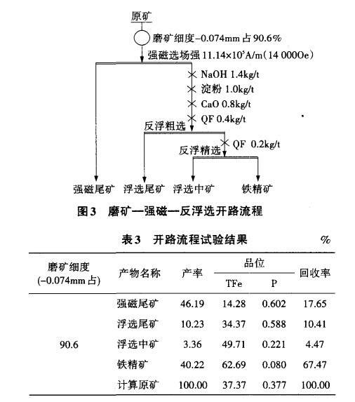 (2)采用磨礦—強磁—反浮選處理該礦石是較為合理的工藝流程??傻闷肺?2.10%、回收率72.20%的鐵精礦。