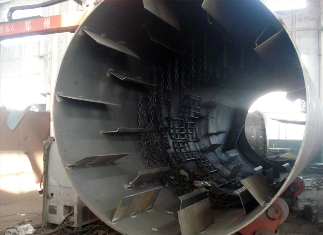 大量物料的干燥器。由于運轉可靠、操作彈性大、適應性強、處理量大,廣泛使用于冶金、建材、食品、輕工、化工、煤炭、醫(yī)藥礦產(chǎn)業(yè)中?;剞D轉筒干燥器一般適應于顆粒狀物料,也可用于部分摻入物料的辦法干燥粘狀膏狀物料或含水量較高的物料。他的優(yōu)點是生產(chǎn)能力大、適用范圍廣、流量阻力小、操作上允許波動范圍較大、操作方便等。常用于烘干沙子、礦粉、煤泥、雞糞、牛糞等。