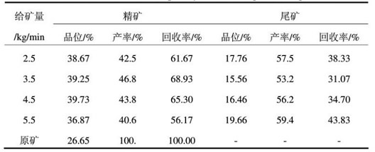 單位時(shí)間內(nèi)的給礦量對磁選設(shè)備分選效果的影響也較大。給礦量過大會(huì)使轉(zhuǎn)環(huán)的負(fù)荷較大,同時(shí)容易造成介質(zhì)堵塞,增加夾帶情況的發(fā)生和目的礦物的損失;給礦量過小又會(huì)使處理量減小,分選系統(tǒng)的使用不能完全發(fā)揮出來,造成效率低下,因此通過試驗(yàn)找到適當(dāng)?shù)慕o礦量也是非常有必要的。
